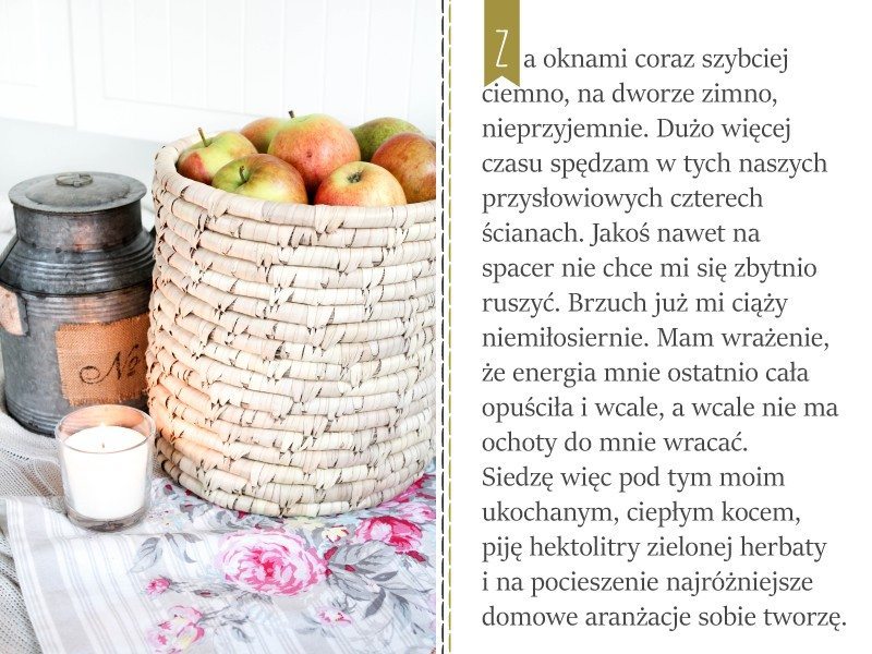 Za oknami coraz szybciej ciemno, na dworze zimno, nieprzyjemnie. Dużo więcej czasu spędzam w tych naszych przysłowiowych czterech ścianach. Jakoś nawet na spacer nie chce mi się zbytnio ruszyć. Brzuch już mi ciąży niemiłosiernie. Mam wrażenie, że energia mnie ostatnio cała opuściła i wcale, a wcale nie ma ochoty do mnie wracać. Siedzę więc pod tym moim ukochanym, ciepłym kocem, piję hektolitry zielonej herbaty i na pocieszenie najróżniejsze domowe aranżacje sobie tworzę.