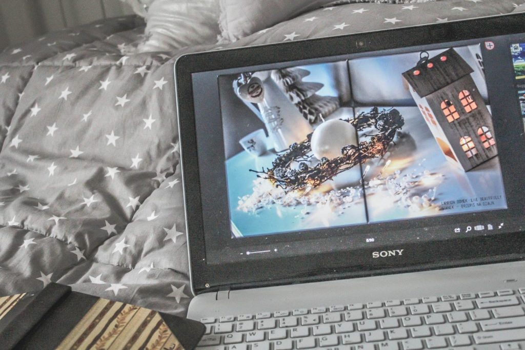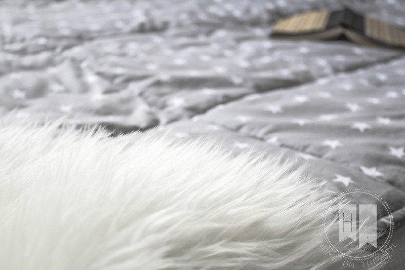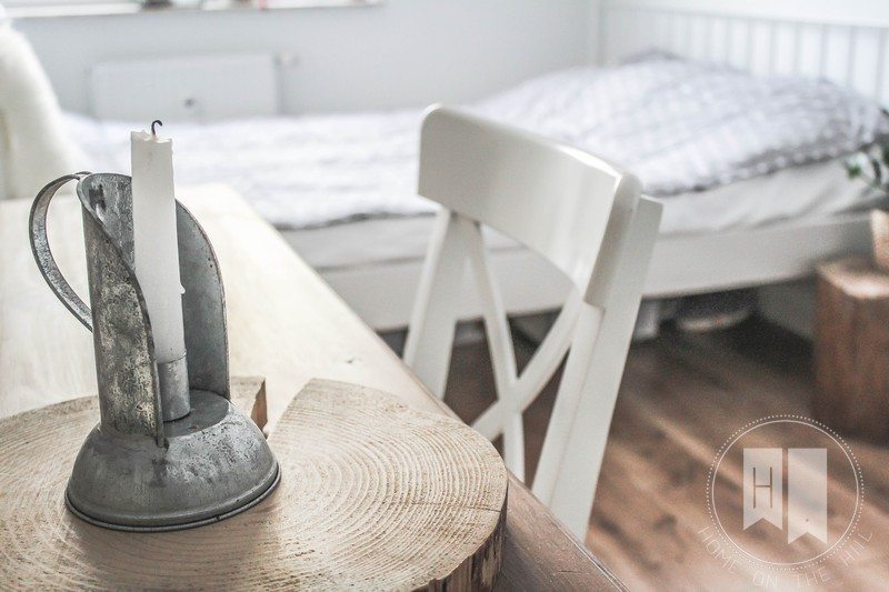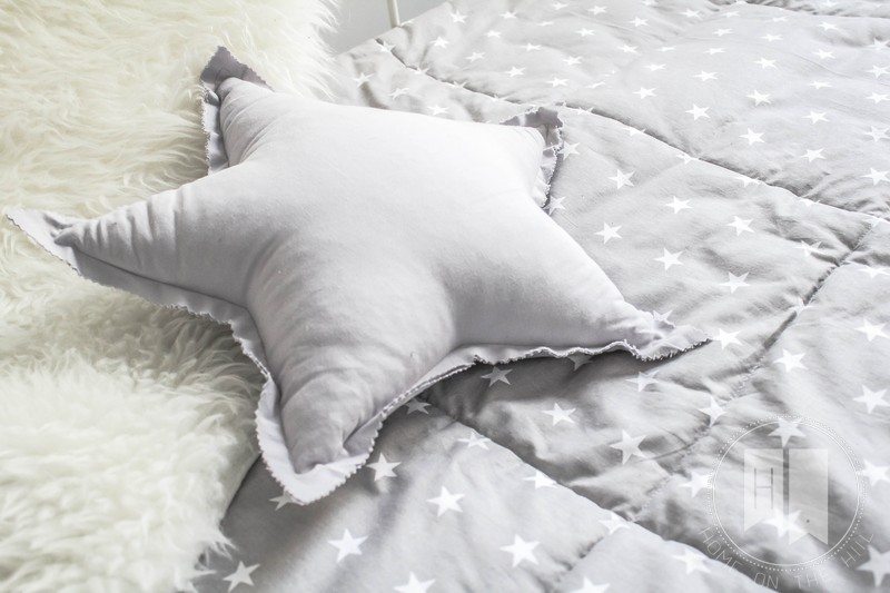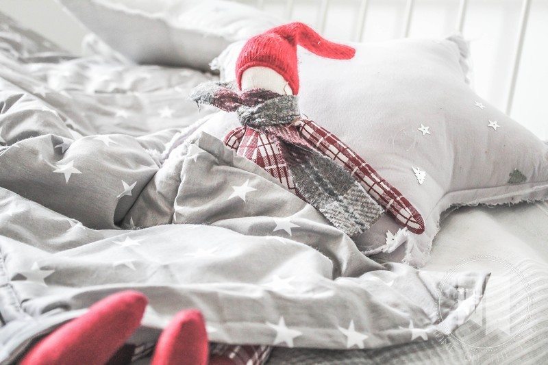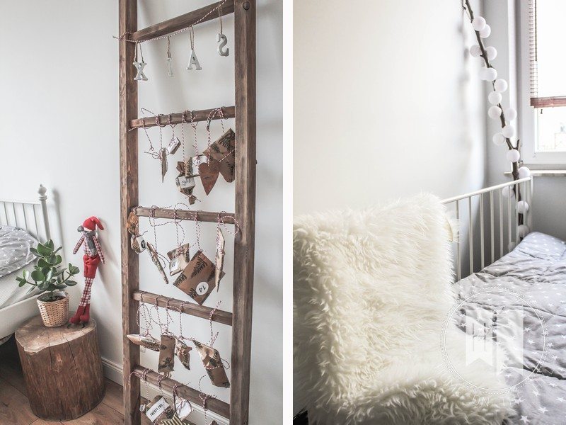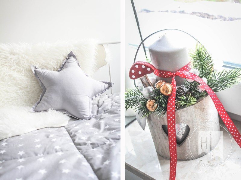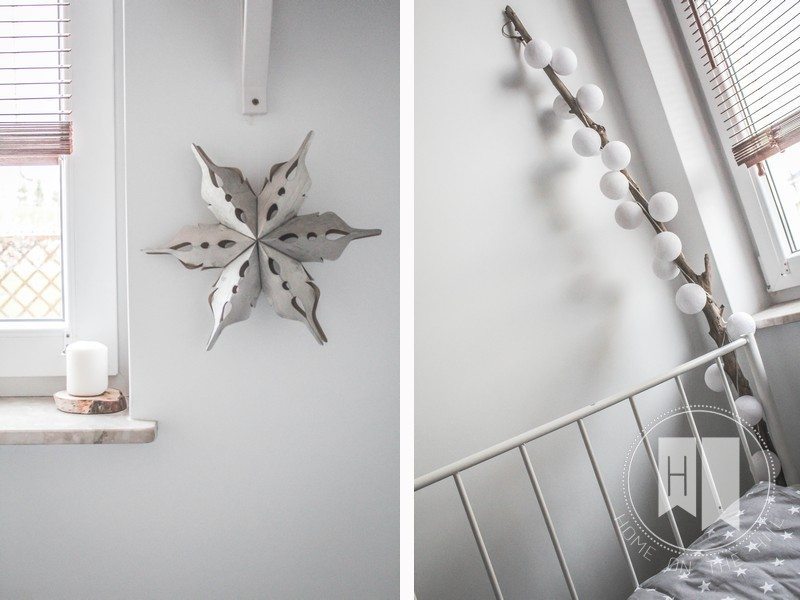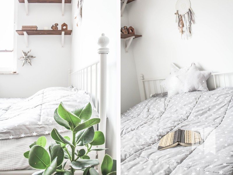 W moim domu rzeczy migrują z miejsca na miejsce. Tak jakoś samoistnie… Idę, przestawiam, dokładam, zmieniam, a jak nie zmieniam to myślę jak zmienić. I tak na okrągło. A to drzewko oliwne wędruje, a to sobie meble u dzieciaków przestawiam, a to nowy koc na kanapę rzucę. Wiecznie kolejne dodatki wyjmuje, a potem przeklinam przy sprzątaniu ile wlezie jak się ciągłe o te kosze potykam, kurze zbieram, jak posprzątam, a te rzeczy fruwać zaczynają i od nowa bałagan się robi. Oj zdecydowanie taka ilość bibelotów nie jest dla pedantów, zwariowaliby szybko. Do tego trzeba podchodzić z dystansem, z przymrużeniem oka, zwłaszcza przy dwójce dzieciaków. Już dawno pogodziłam się z tym, że z naszym nieładem nie wygram. Pewnie byłoby łatwiej bez tych wszystkich rzeczy, dodatków, wazoników, lampioników i tysiąca pierdółek, ale ja po prostu nie potrafię, no bo mi te rzeczy samoistnie migrują. Nie wierzycie? Dajmy na to nasza nowo wyremontowana sypialnia. Skandynawska, delikatna, tylko biel i drewno. Prawie żadnych bibelotów, odrobinę surowo, ale nie na tyle, aby nie było przytulnie. No w końcu miejsce z oddechem! Niezagracone, nieprzeładowane, spójne, idealne do odpoczynku. Taaak… Najpierw wylądowała tam adwentowa drabina. Musiała, bo jak inaczej, tylko tam w ciągu dnia Antoś sam nie wchodzi, więc nie zwali jej na siebie. Jak przyszła ta drabina, to stwierdziłam, że chyba zostawię ją tu już na stałe. No w końcu drewniana, naturalna, komponuje się świetnie z całym wnętrzem. Następnie ze Sweet Village otrzymałam pled. Szary w białe gwiazdki, gruba, piękna narzuta. No ja maniaczka narzut jakbym mogła takiej sobie odmówić? Wpasowała się idealnie, przytulniej się zrobiło. Jak narzuta, to zaczęło mi poduszek brakować, całe szczęście, że te różne rzeczy same po domu chodzą, to mi do sypialni gwiazdki przyszły… No przecież za drzwi ich nie wyrzucę;)